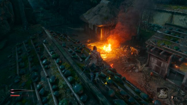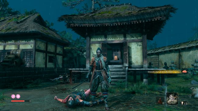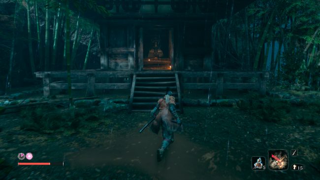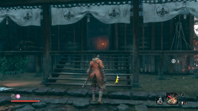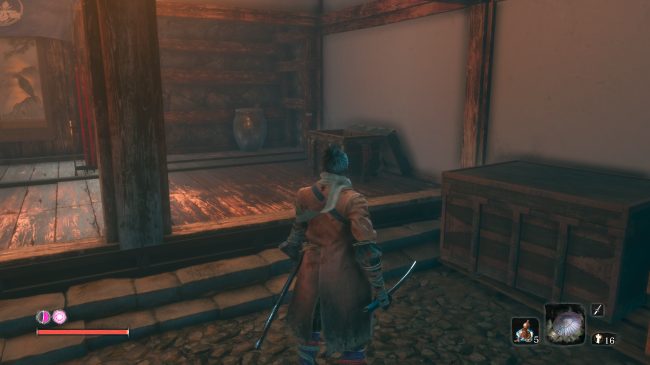 เมื่อผู้เล่นเข้าปราสาท Ashina Castle เกมมอร์จะพบกับทหารสองคนกำลังยืนคุยกัน ให้ผู้เล่นกำจัดทหารทั้งสองคนเพื่อขโมยกุญแจโกดังเก็บของ แล้วผู้เล่นมุ่งหน้าไปที่ Ashina Reservoir (เกมมอร์สามารถใช้เส้นทางลัดด้วยการกระโดดผ่านทางด้านขวามือ) ให้ผู้เล่นเดินตามเส้นทางหลัก เกมเมอร์จะพบบ้านหลังหนึ่งที่จำเป็นต้องใช้กุญแจในการปลดล็อก
