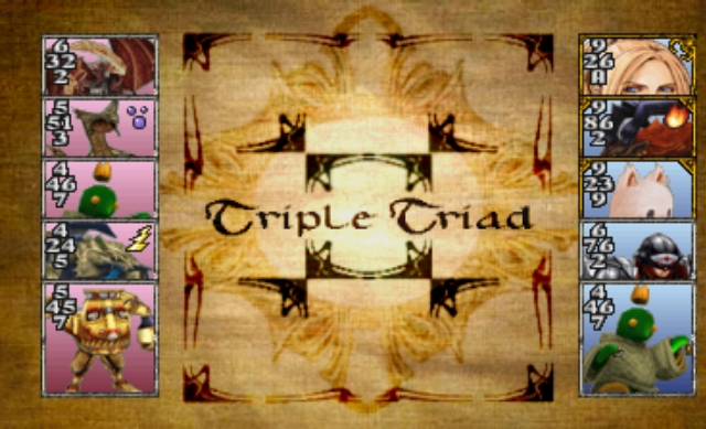 เกม Triple Triad เป็นการแข่งกันระหว่างผู้เล่นสองคนบนกระดานที่มีขนาด 3×3 เลือกการ์ดของตัวเองมาคนละ 5 ใบ ผลัดกันวางการ์ดลงบนกระดานเพื่อจับการ์ดของฝ่ายตรงข้ามโดยดูจากค่าตัวเลขของทิศทางที่การ์ดชนกัน (ค่าพลังของการ์ดมี 4 ค่า บน ล่าง ซ้าย ขวา) เมื่อจบเกมแล้วใครครอบการ์ดได้มากกว่าจะถือว่าเป็นฝ่ายชนะ และจะสามารถเลือกการ์ด 1 ใบ (หรือมากกว่า) จากชุดการ์ดของผู้แพ้ได้