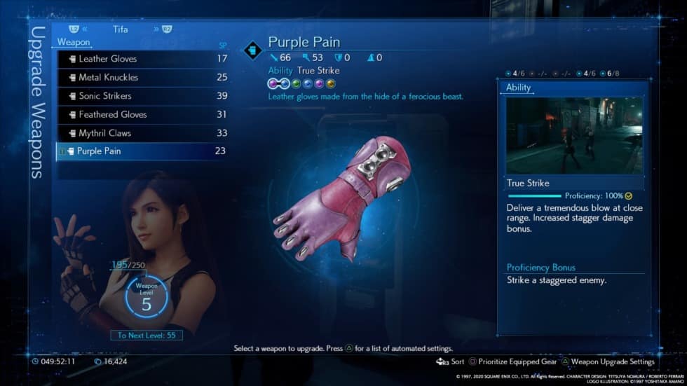 ถุงมือหนังชิ้นแรกของ Tifa ที่ถ้าอัปเกรดจนเต็มจะเพิ่มให้ทั้งพลังโจมตีและป้องกัน รวมไปถึงการโมตีทางด้านกายภาพและเวทมนตร์ที่สูงไม่ยิ่งหย่อนกว่ากันด้วย