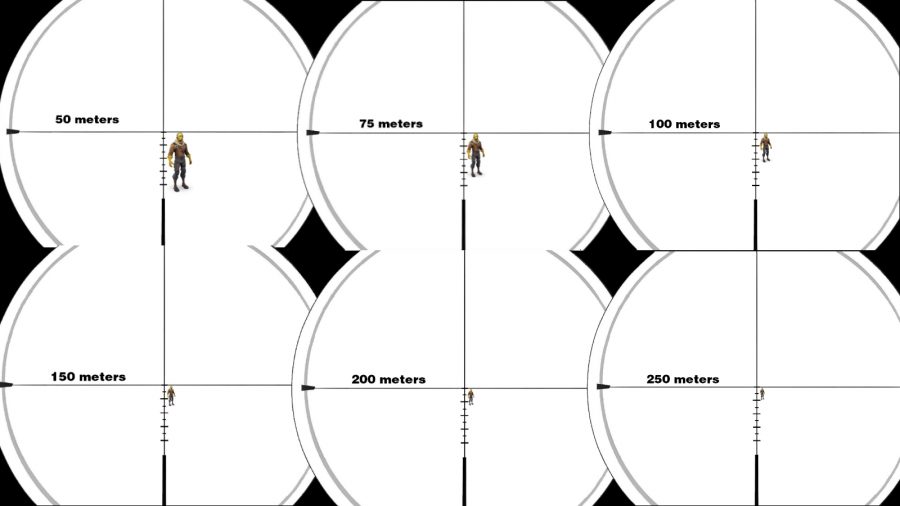 150 เมตร – ใช้เส้นที่สองเล็งที่หน้าอก หรือกึ่งกลางระหว่างเส้นที่หนึ่งและสองตรงหัว