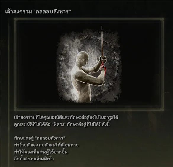 คาถาที่ร่ายแล้วจะล่องหนได้พักหนึ่ง ใช้คู่กับเถ้าสงคราม Assassin’s Gambit (กลลอบสังหาร) เพื่อประสิทธิภาพสูงสุด