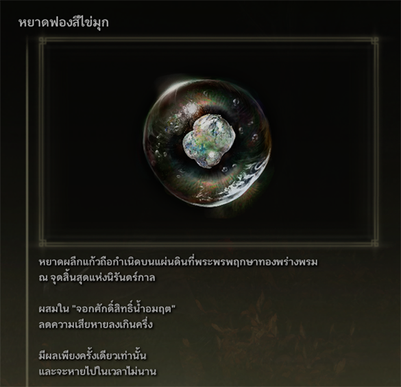 Opaline Bubbletear ดรอปจากบอส Erdtree Avatar (ร่างแยกพฤกษาทอง) ตัวที่อยู่ตรง Minor Erdtree (พฤกษาทองน้อย) ในตอนใต้ของ Limgrave (ลิมเกรฟ)