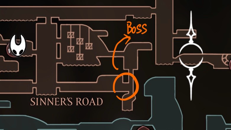 - แต่ถ้าสำรวจมาเรื่อย ๆ จนถึงบริเวณขวาล่างของด่าน จะสามารถใช้ท่าลอยตัวเพื่อขึ้นไปเจอกับ Chapel ได้ และจะได้สู้กับบอสเพื่อปลดล็อค Crest ใหม่มาใช้