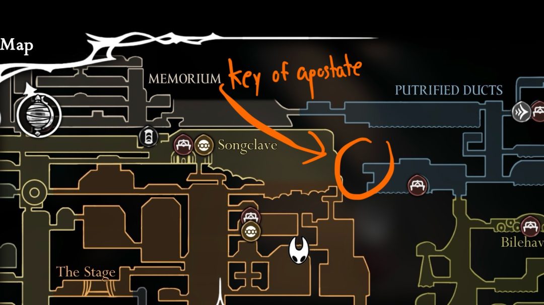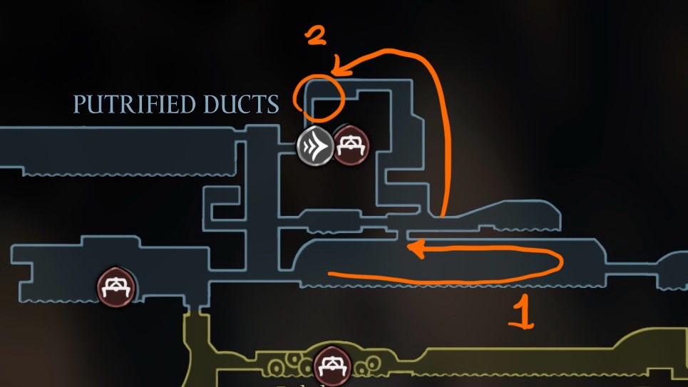 - ไปที่ด่าน PUTRIFIED DUCTS -> Pale Lake/Fleatopia ที่อยู่ฝั่งขวาสุด จะมีจุดที่สามารถกระโดดสูงขึ้นไปและเจอกับป้าย ๆ หนึ่ง