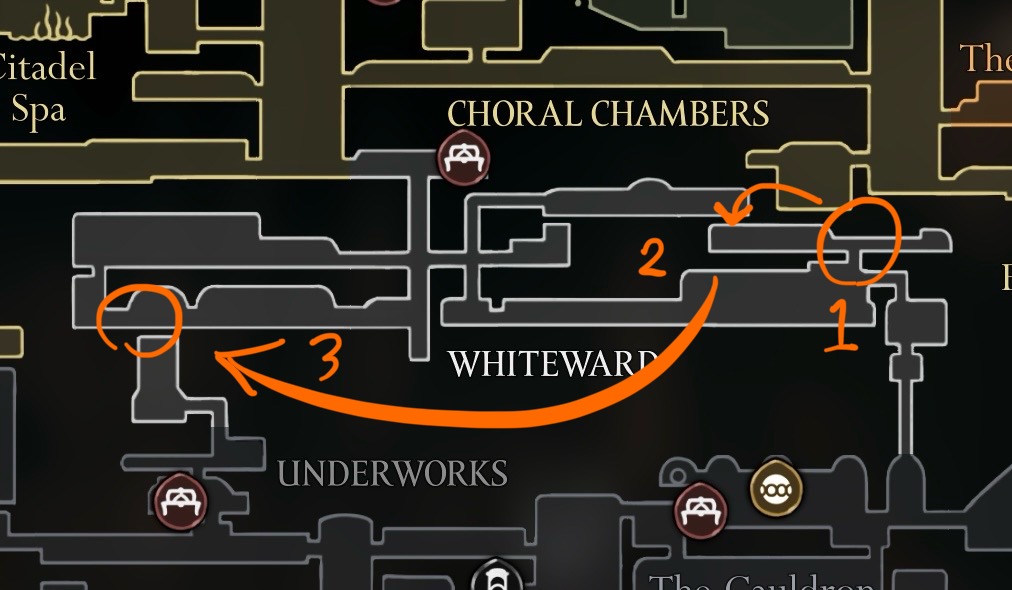 - เส้นทางการสำรวจจะเป็นตัว U ย้อนไปชั้นล่างแล้วขึ้นบนกลับมาทางขวา ตรงจุดนี้จะเป็นการเปิดทางลัดกลับไปห้องบอส Cogwork Dancers ห้องเดิม รวมถึงตรงทางขวา (ก่อนถึงทางลัดดังกล่าว) จะมีทางเชื่อมต่อไปยังด่าน WHISPERING VAULTS ด้วย