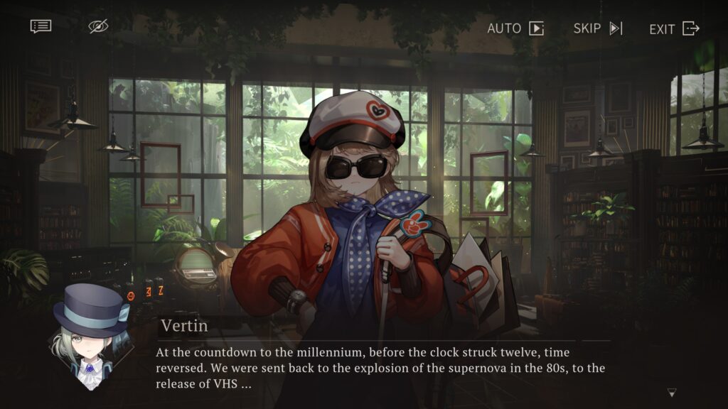 Vertin: งั้นฉันขอแนะนำตัวอีกรอบ ฉันมาจากสถาบัน Saint Pavlov ที่เดียวกันกับที่ทีมสืบสวนที่เธอเพิ่งเจอมาน่ะล่ะ มันเป็นที่ที่เราเติบโตขึ้นมาด้วยกัน ฉันคือ Timekeeper ผู้บันทึกเวลาของโลกภายนอก