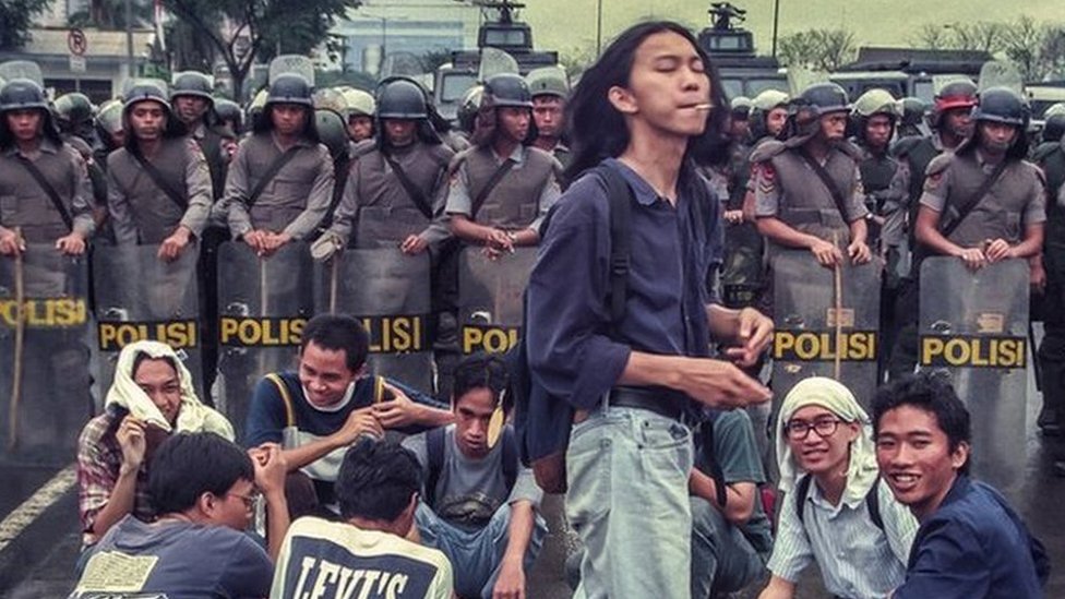 การประท้วงโดยมีนักศึกษาเป็นแกนนำดำเนินไปอย่างต่อเนื่องนับจากนั้น จนกระทั่ง 27 เมษายน 1998 เหตุการณ์ฟางเส้นสุดท้ายก็ปะทุขึ้นเมื่อแก๊สน้ำตาที่ใช้สลายการชุมนุม ทำให้นักศึกษาประสบอุบัติเหตุทางรถยนต์จนเสียชีวิต การประท้วงจึงยกระดับไปเป็นจลาจลลุกลามทั่วทุกหัวเมืองใหญ่ นอกจากอาคารราชการกับธุรกิจของพวกนักการเมืองจะถูกโจมตีแล้ว บ้านเรือน ยานพาหนะ และคนอินโดเชื้อสายจีนทั่วไปก็ตกเป็นเป้าเช่นกัน กว่าเหตุการณ์จะสงบก็ล่วงไปถึงวันที่ 21 พฤษภาคม เมื่อซูฮาร์โตประกาศลงจากตำแหน่ง ปิดฉากยุคระเบียบใหม่ ประเทศอินโดนีเซียก็เข้าสู่ยุคปฏิรูป