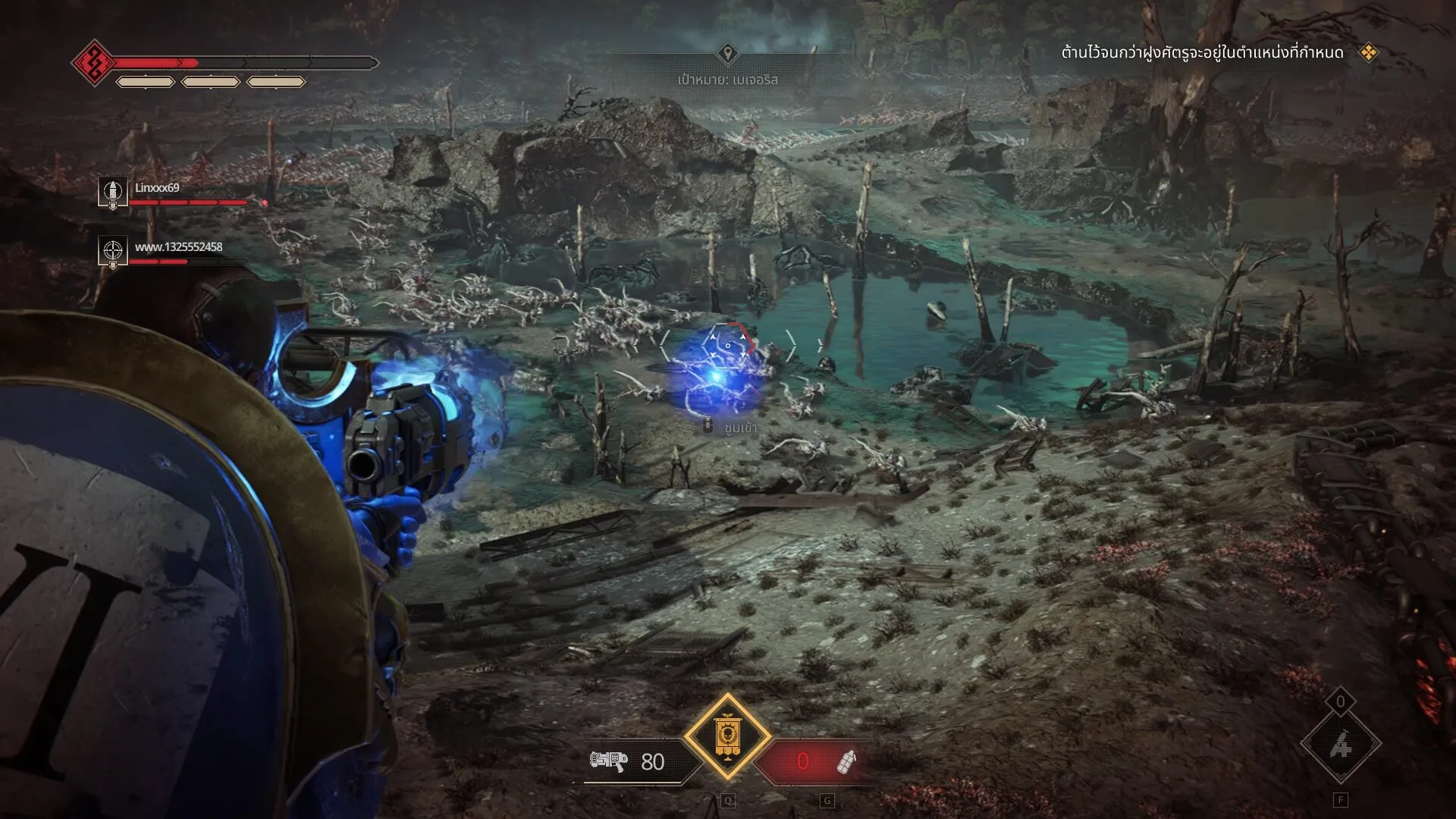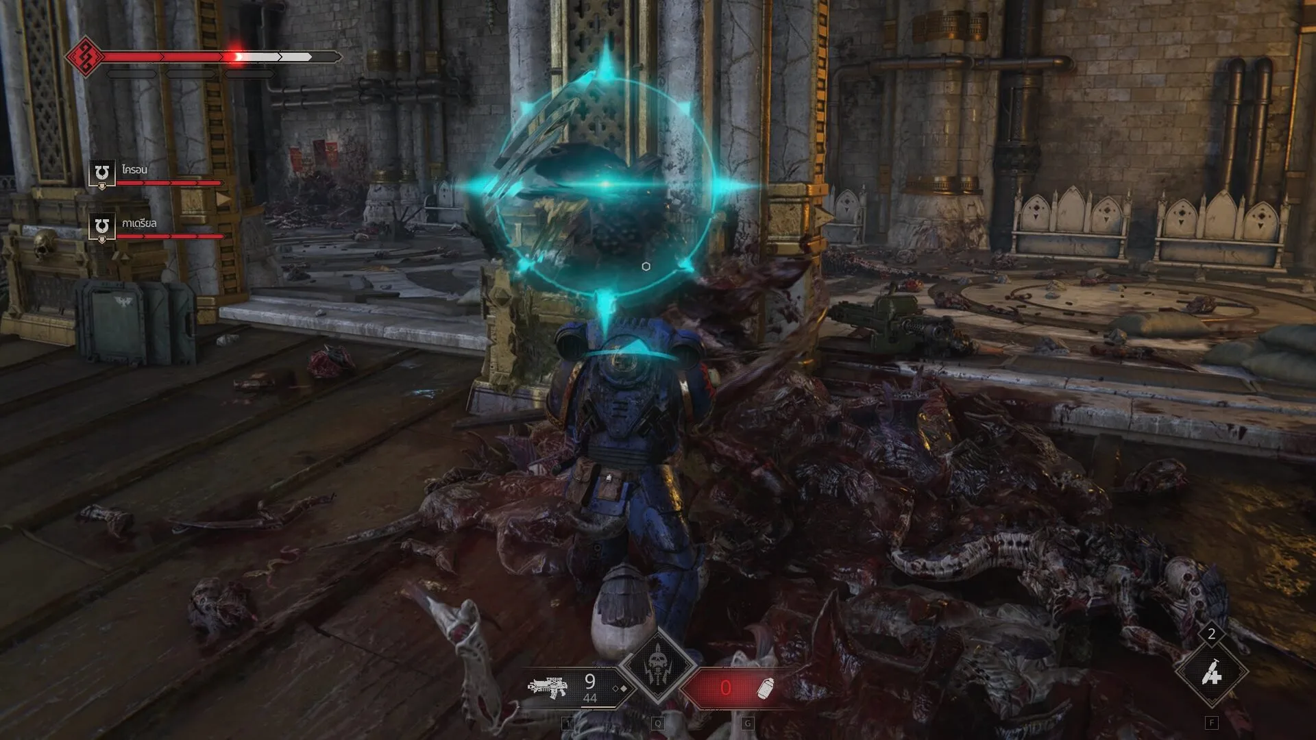 คือแม้ว่ามันจะให้กระสุนเราน้อย และรูปแบบภารกิจไม่ได้หลากหลาย แต่เขาไปเพิ่มสีสันให้เกมเพลย์แทนด้วยลูกเล่นต่าง ๆ ที่ทำให้มันไม่ใช่แค่การเดินหน้ายิงแบบทั่วไป เพราะถ้าทำแบบนั้น นอกจากจะน่าเบื่อแล้ว มันยังไม่มีความต่างอะไรจากเกมอื่น ๆ แต่ใน Space Marine 2 คุณจะต้องใช้ทุกอย่างที่มีเพื่อฝ่าฝูงศัตรูไปให้ได้ นี่ยังไม่ได้พูดถึงการกลิ้งหลบ และการใช้ระเบิดที่ในบางสถานการณ์ก็จำเป็นมาก ๆ ในการเคลียร์เวฟศัตรู เพราะระเบิดเองก็มีหลายประเภท ทั้งเจาะเกราะ สะเก็ด หรือพลังงาน เอาง่าย ๆ คือต่อให้คุณเล่นเกมนี้ด้วยความยากระดับปกติ คุณก็ไม่สามารถชิลล์ได้ ไม่งั้นอาจได้ไปรับใช้องค์จักรพรรดิในร่างวิญญาณแทน ซึ่งพอเล่นเข้ามาก ๆ มันทำให้เราลืมความธรรมดาของภารกิจไปได้เลย นับว่า Saber เขาแก้ปัญหาได้ถูกจุดดี ในเมื่อมันไม่หลากหลาย ก็ทำให้เกมเพลย์ที่มันธรรมดา เคี่ยวผู้เล่นจนตื่นเต้นตลอดเวลา