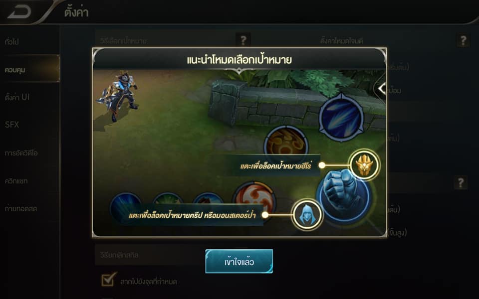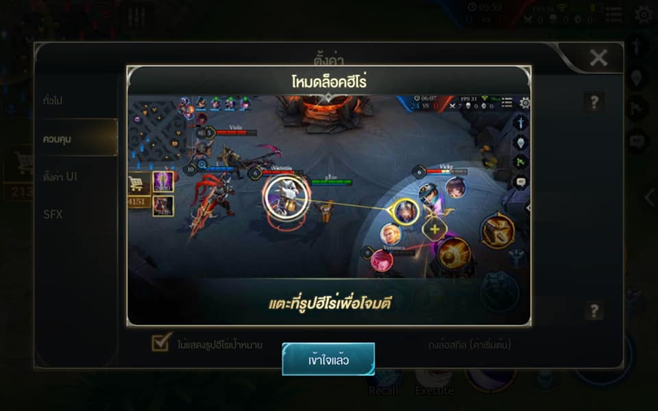 อย่างต่อมาคือสิ่งที่แนะนำอย่างยิ่งให้เปิดไว้ นั้นคือในหมวดการล็อกเป้าหมายจากรูปฮีโร่ โดยให้เลือก “แสดงรูปเป้าหมายที่โจมตีได้” ซึ่งเกมจะปรากฏรูปของ Hero ฝ่ายตรงข้ามทุกตัวที่อยู่ใกล้ ๆ เรา โดยเราสามารถกดที่รูป Hero เพื่อโจมตีหรือใช้สกิลใส่เเค่ฮีโร่ตัวนั้นเพียวตัวเดียวได้ จำเป็นอย่างมากในช่วง Team Fight ซึ่งเราต้องจัดการเป้าหมายเป็นคน ๆ ไป