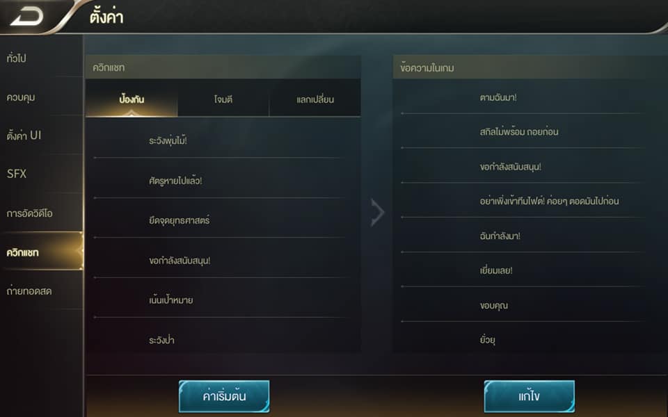 ก่อนอื่นต้องเริ่มจากควิกแชทก่อน เนื่องจากว่าการตั้งค่านี้จะทำได้ก็ต่อเมื่ออยู่ด้านนอกเกมเท่านั้น ควิกแชทคือข้อความด่วนที่เมื่อกดเเล้วจะเเสดงผลในเกมทันที (พร้อมเสียงประกอบ) โดนเราไม่ต้องพิมพ์ ซึ่งตรงนี้หลายคนอาจเคยใช้ เเต่อาจไม่รู้ว่ามันตั้งค่าได้ด้วย
