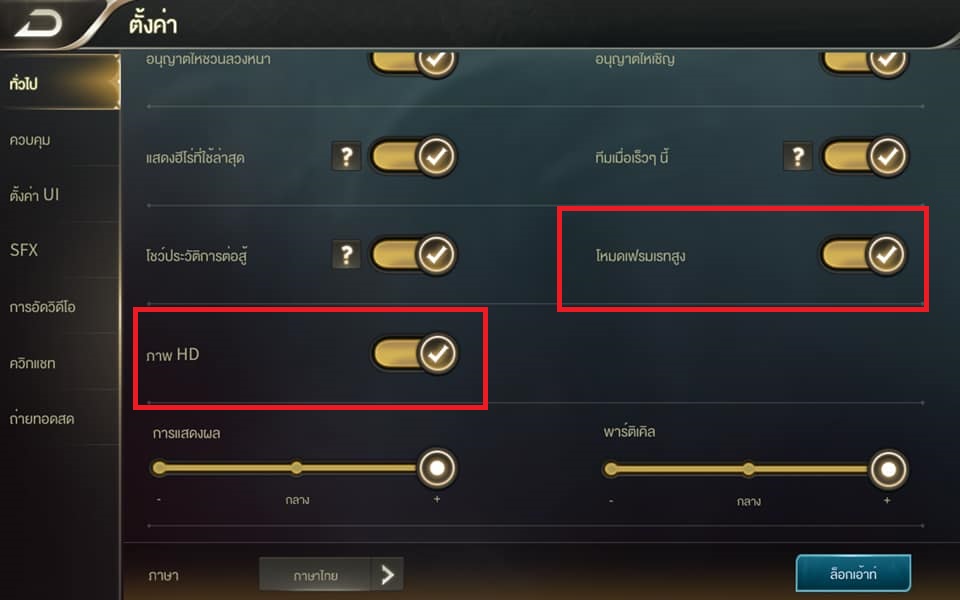 การตั้งค่าทั่วไปก็เป็นอีกสิ่งที่สำคัญไม่เเพ้กัน โดยในการตั้งค่านี้จะมีอยู่ 2 สิ่งที่สำคัญคือ “ภาพ HD” เเละ “โหมดเฟรมเรทสูง” โดยในการตั้งค่าปรกตินั้นเกมจะปิดในส่วนนี้ไว้เพื่อประหยัดพลังงาน จริง ๆ แล้วในส่วนนี้จะขึ้นอยู่กับอุปกรณ์ของเเต่ละคน เเต่สำหรับคนที่มีอุปกรณ์ที่แรงพอ การปรับในสองส่วนนี้ถือว่าสำคัญมาก