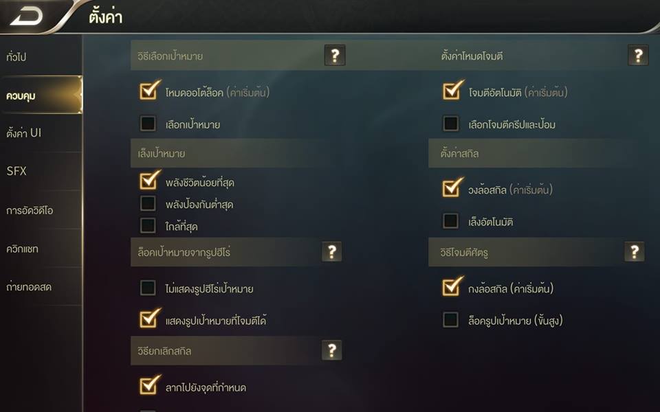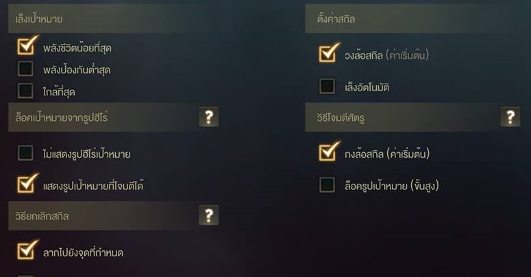 เริ่มจากในส่วนเเรก วิธีเลือกเป้าหมาย ในส่วนนี้จะเป็นการควบคุม “เป้าหมายที่จะโจมตีก่อน” โดยในส่วนเเรกนั้นแนะให้เป็นเเบบ “ออโต้ล็อค” เนื่องในการเล่นจริงเราจะพบว่า หากเลือกในเป็น “เลือกเป้าหมาย” ในหลาย ๆ ครั้ง Hero จะเปลี่ยนเป้าโจมตีไปเฉย ๆ เเบบที่เราไม่ได้ตั้งใจ (โดยที่ยังตีเป้าเเรกไม่ตาย) ซึ่งเกิดขึ้นบ่อยมากในขณะฟาร์มป่า เเล้วอยู่ ๆ มีคู่ต่อสู้เดินมา