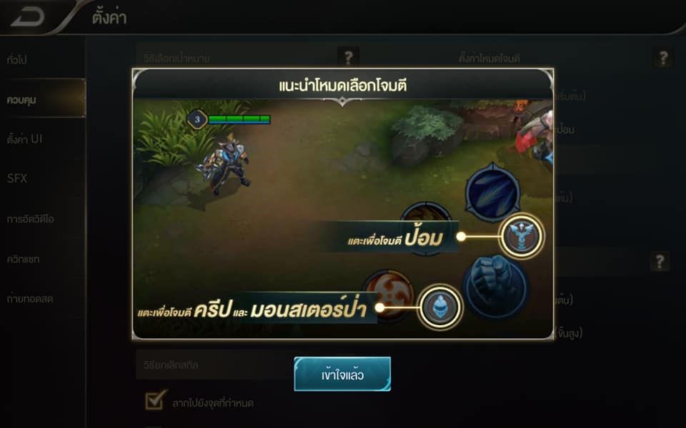 สำหรับในใส่การตั้งค่าโหมดโจมตีนั้น เเนะนำให้เลือกเป็น “เลือกโจมตีครีปและป้อม” เพราะสำคัญมากในช่วงท้าย ๆ เกมที่เราอาจต้องโจมตี Core ของฝ่ายตรงข้ามอย่างรวดเร็ว การตั้งค่านี้จะทำให้ Hero ของเราโจมตีเฉพาะ Core หรือป้อมเท่านั้นโดยไม่เปลี่ยนไปโจมตี Hero หรือครีปฝ่ายตรงข้ามที่เดินเข้ามาหา